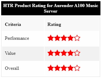 Az Aurender A100 egy olyan számítógép, amelyet zenei szerver funkcióra, és zenei fájlok lejátszására optimalizáltak. Szerintem az A100 használata jelentős előre lépést jelent egy számítógép bázisú lejátszás rendszerhez képest. Az A100 zenei hangzás és felhasználói felület tekintetében is jobb annál. A rajta keresztül lejátszott fájlok sok apró zenei részletet tartalmaznak, amely a legtöbb rajongót ki fogja elégíteni. A bemutatója kicsit meleg tónusú, ezért hosszan hallgatható.