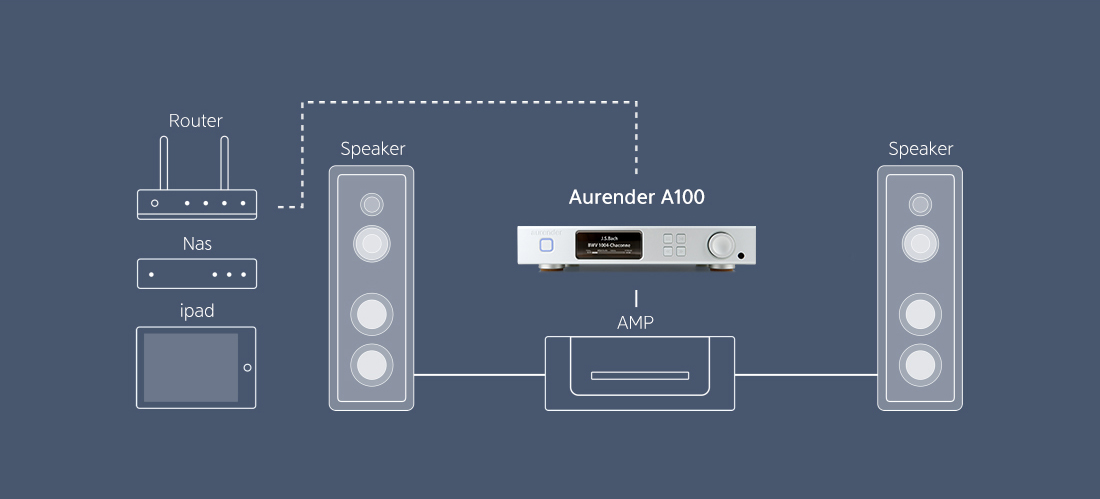 Az A100 DAC chipje a PCM formátumokat 768 kHz 32 bit felbontásig támogatja, emellett képes a DSD64 és DSD128 DoP formátumok feldolgozására is. Az SPDIF optikai bemeneten 192 kHz 24 bit a limit. Ebben a készülékben az Aurender nagyon ügyelt a zajcsökkentésre. Teljesen árnyékolt a tápegység, árnyékolt az aszinkronizált USB Audio kimenet, továbbá külön toroid trafós tápegységet kapott a zene szerver, a digitális rész és a DAC is.