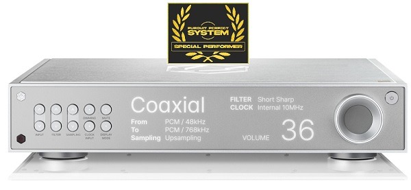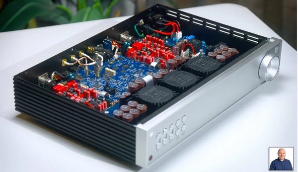 Számomra túlságosan összetett, de a szimmetrikus felépítést rögtön észrevettem. AKM AK4191 chip végzi a belső digitális szűrést, ami aztán a jelet az AKM AK4499EX-re küldi, itt történik az analóg konverzió. A jel útja duál JFET műveleti IC-ken, és OCC réz kábeleken vezet át. A belső órajel generátor egy nagyon pontos OCXO. Meggyőző mennyiségű szűrő kapacitás koronázza meg a látványt.