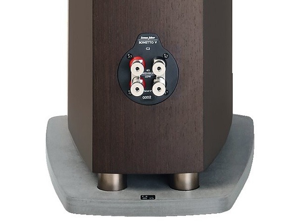 A Sonetto V G2 megtartotta a lefelé mutató reflex portot, de a beton talp függetleníti a hordozó felülettől. (nem tudja túlcsillapítani az, ha puha szőnyegre helyezi – Fordító megjegyzése) Választható tüske, vagy gumi lábazat a padló figyelembe vételével.