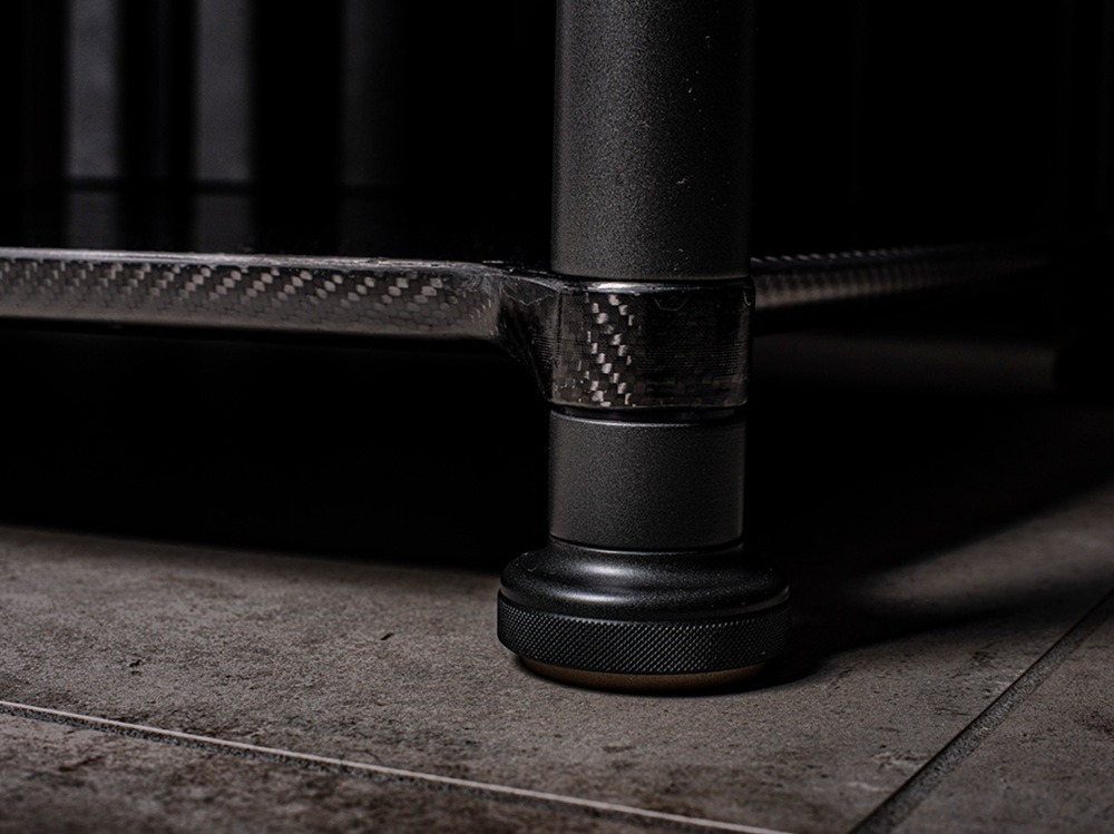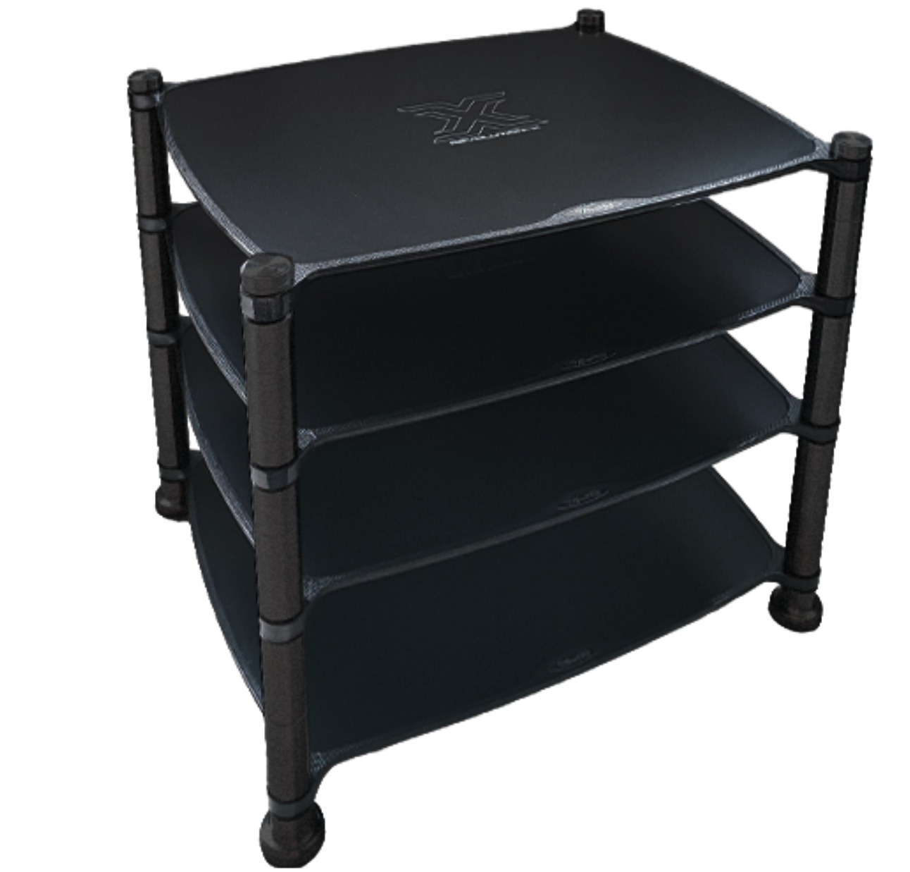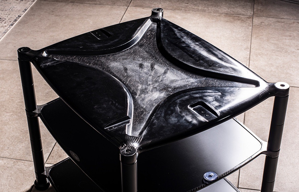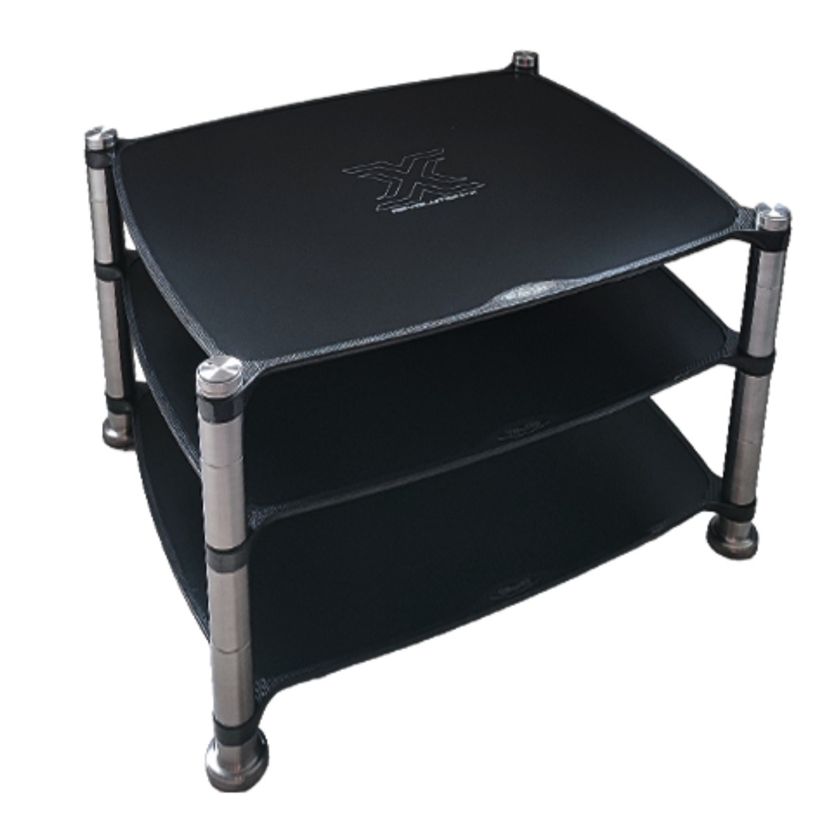 A polcok direkt módon kapcsolódnak a fém lábazathoz. A polc anyaga 2 mm vastag, de az egy irányba rendezett szén szálak hatalmas terhelést képesek elviselni. A felső panel 3 mm vastag szendvics szerkezet. Ötféle anyag kombinációja, amelyet két alumínium réteg fog közre. A Revolution X logo lézer gravírozott.