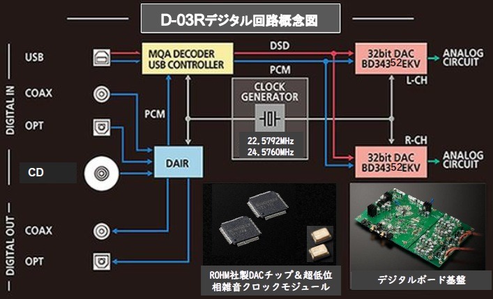 A legmodernebb nagy felbontású, alacsony zajú buffer a CD-DA formátumból is a lehető legtöbbet hozza ki. A DAC egység szíve a duál mono konfigurációban üzemelő két darab ROHM BD34352EKV chip készlet. Kimagasló pontosságú időzítést és ultra alacsony zajt garantál ez a rendszer. Minden bemeneten külön alacsony jittert biztosító áramkör üzemel, ezen kívül master clock egység gondoskodik a pontos órajelről.