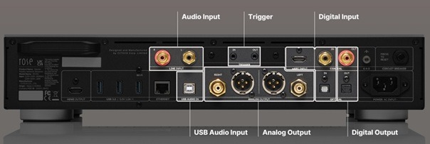 XLR és RCA analóg, koaxiális és optikai kimenetek állnak rendelkezésére. Ezek mellett analóg bemenet, digitális bemenetek széles skáláját kínálja. A be és kimenetek a menüben testre szabhatók, könnyedén az adott felhasználás módhoz igazíthatók. Több USB-A a külső tárolók, egy USB-B a számítógép, Egy eARC HDMI a TV hang, Bluetooth a telefon tartalom lejátszására. A Bluetooth modul a legújabb v5.4 specifikációkat támogatja. A koaxiális bemeneten PCM 32 bit/384 kHz és DSD128 formátumokat támogatja. A TV felé külön HDMI kimeneten keresztül továbbíthatók a zenei videók. Trigger be és kimenetek teszik rugalmasabbá a rendszerbe integrálást.