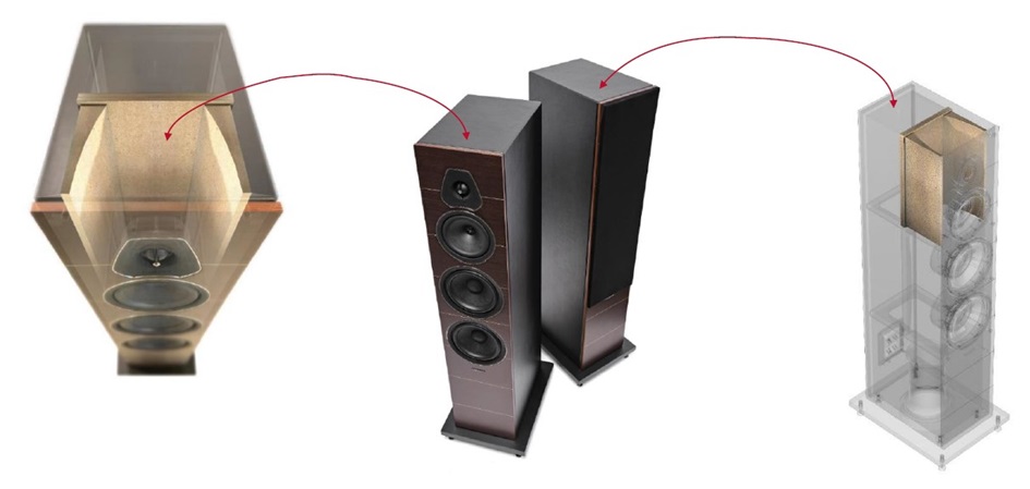 A magas és közép sugárzó belső kamrájának alakja a gyártó magasabb kategóriában alkalmazott lant forma. Ez természetes, valódi hangszer hangú bemutatót kölcsönöz, amellett, hogy a kabinet merevségét jelentős mértékben fokozza. Az énekhang természetes bemutatás módja a másik erőssége.