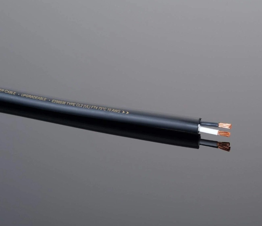 - Two 10 AWG conductors in a fire retardant, pressure-extruded outer jacket that reduces electro-mechanical vibration