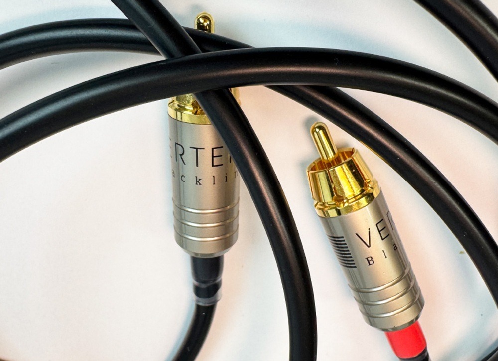 A Vertere Blackline kábeleket kézzel építik az Egyesült Királyságban. A kábel irányjelölésén található a származást igazoló felirat.